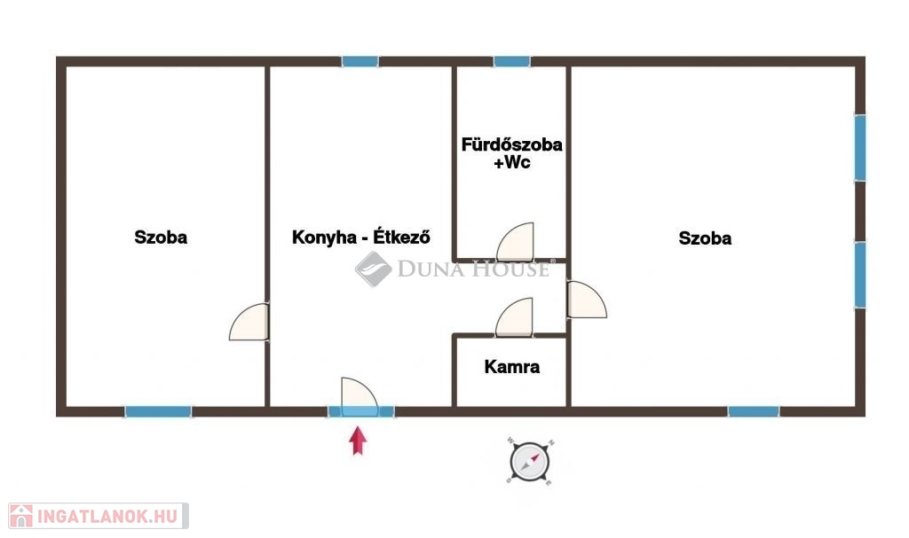 Az ingatlanban egy étkezős konyha, két különbejáratú szoba, egy fürdőszoba+wc, és egy közlekedő helyiségek kaptak helyet. Tárolás céljára egy kamra is rendelkezésre áll. Praktikus elrendezése okán optimális fiatalok, összeköltözők, idősek, kisebb családok számára is.
