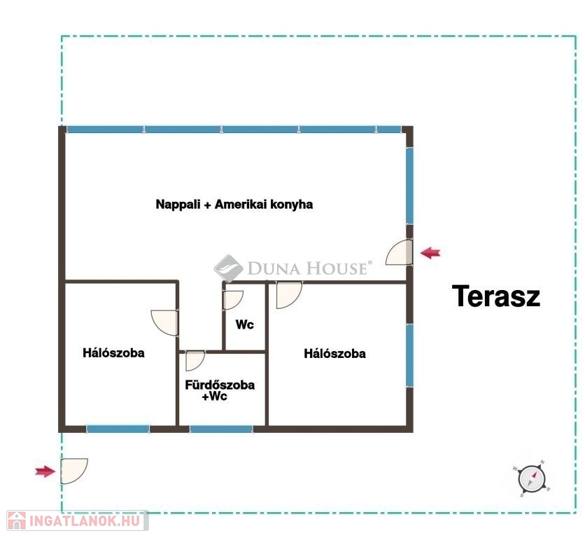 Az ingatlanban egy, a Balaton irányában teljes üvegfelülettel rendelkező, tágas, amerikai konyhás nappaliszoba, két különnyíló hálószoba, egy fürdőszoba+wc, egy külön wc, és a helyiségeket összekötő közlekedő találhatóak. A teraszra a nappaliból két irányban is kiléphetünk.