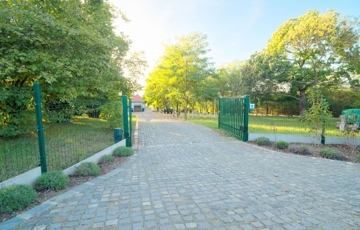 A két utca felől is megközelíthető birtok újszerű kerítéssel teljesen körbekerített, gépkocsibeállás elektromos, távvezérelt gépkocsikapun keresztül történik. A területen tulajdonosa az összes szükséges földmunkát elvégezte, így bár lankás a terület, annak szinte minden négyzetcentimétere jól használható.